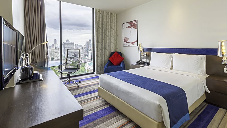 - Khách sạn đẹp ở Bangkok có phòng trang trí hiện đại, với tông màu xanh rất đặc trưng của thương hiệu Holiday Inn Express