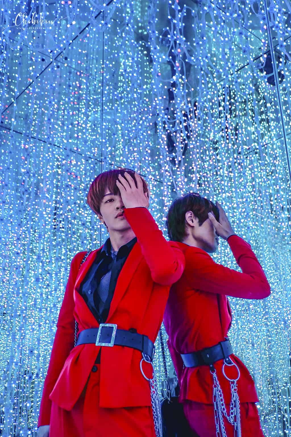 I pair my red suit with a big chain and ring detail waist belt and a mesh t-shirt to add a little K-pop inspiration for my outfit.